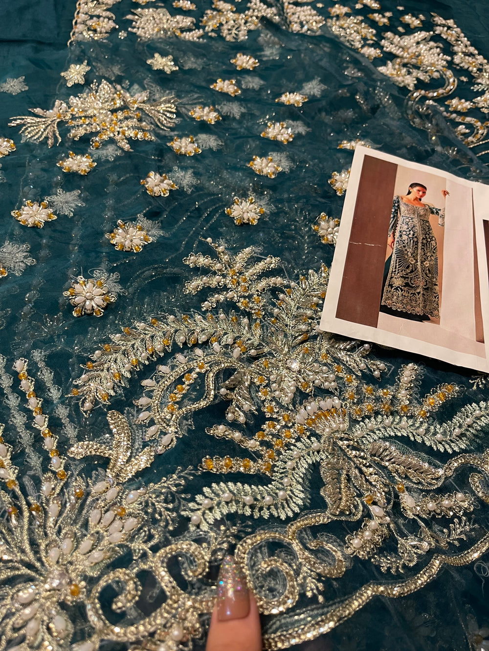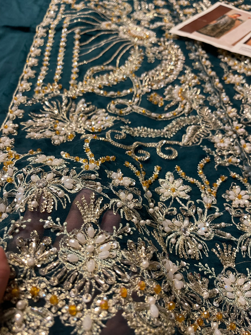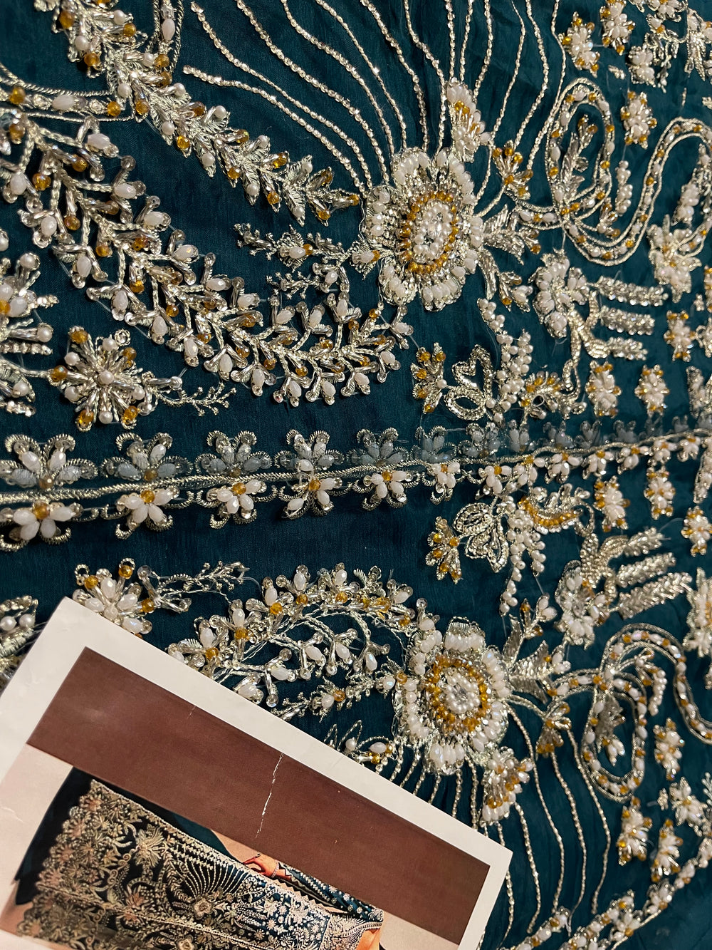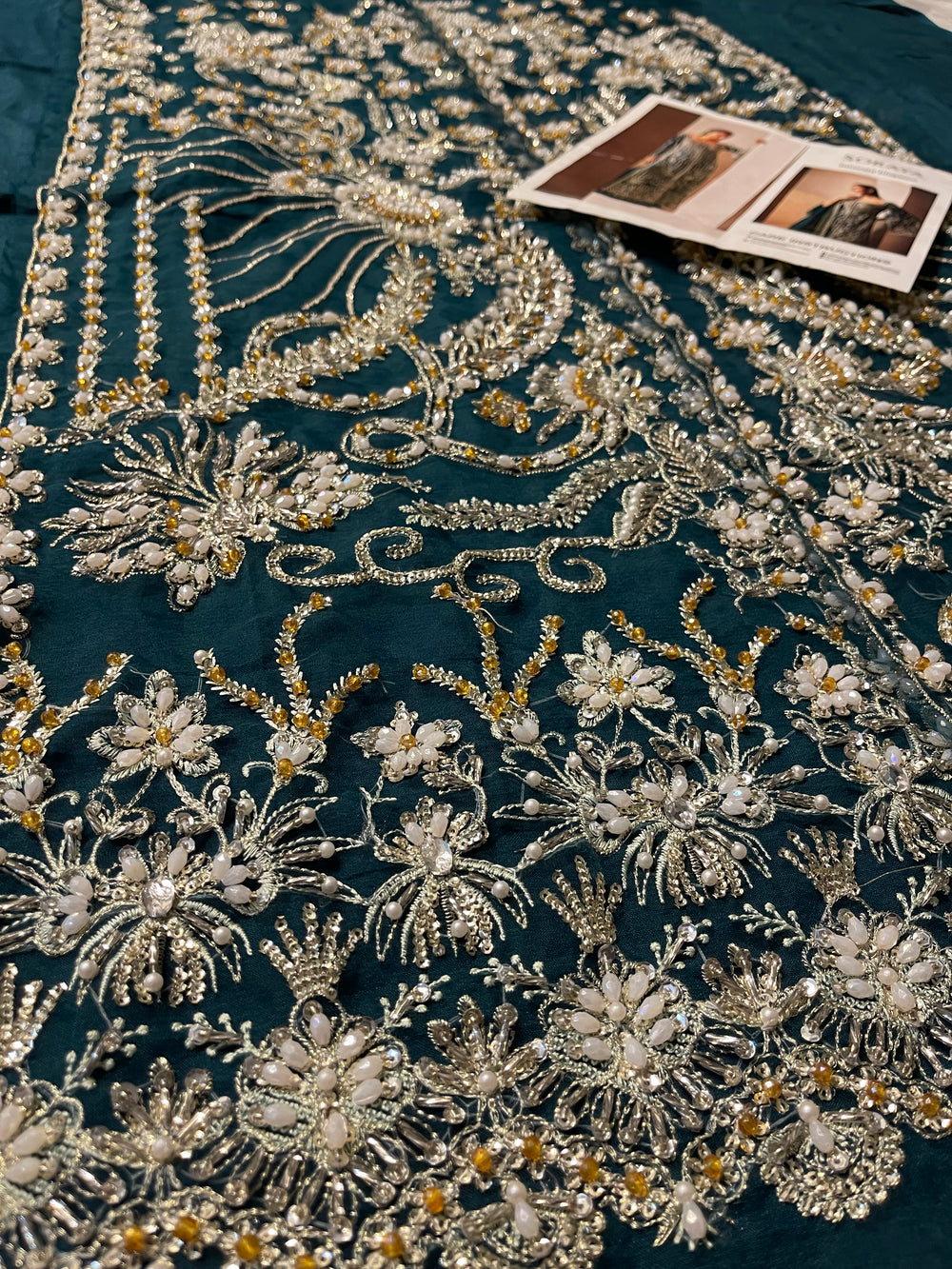 Luxe is a mesmerizing viridescent emerald organza flared gown, adorned with modern, rich silver dhabka, hand beaded details and captivating cape sleeves, elegantly finished with hanging beads paired beautifully with organza duppata heavily embroidered on borders. The ensemble is perfectly complemented by sleek raw silk trousers.