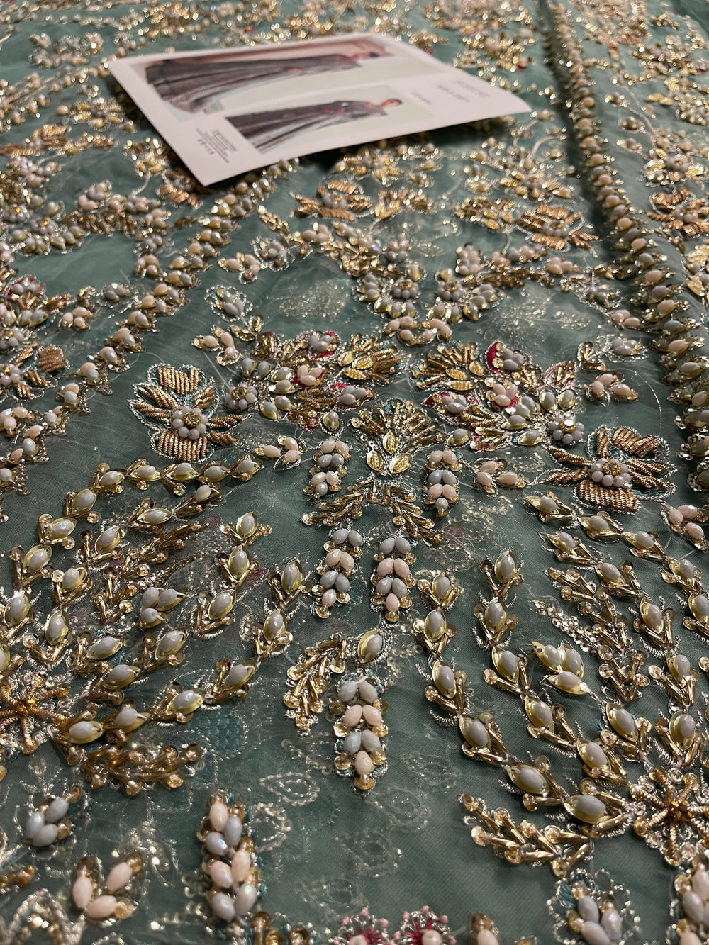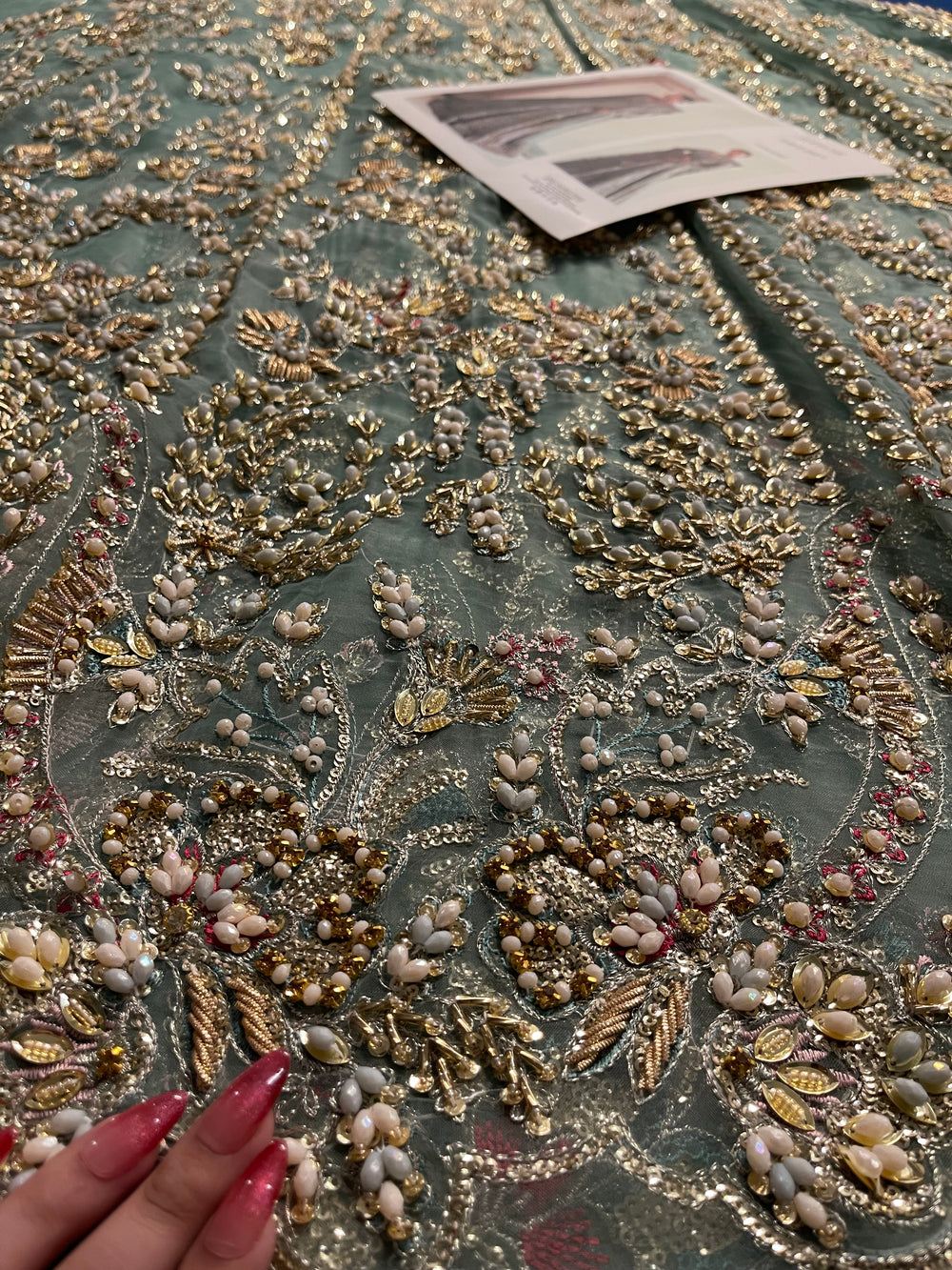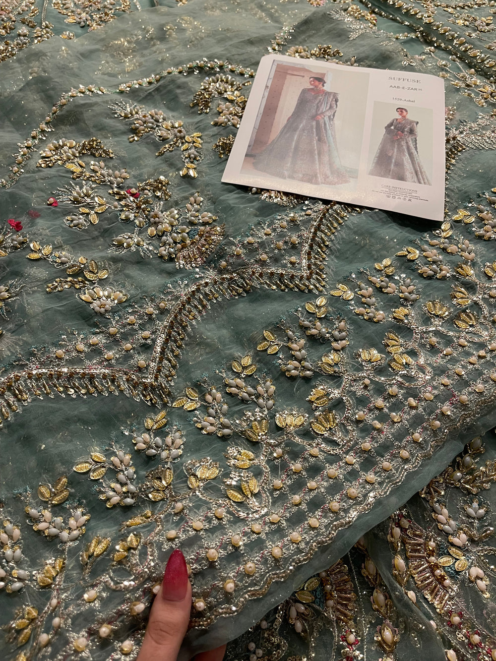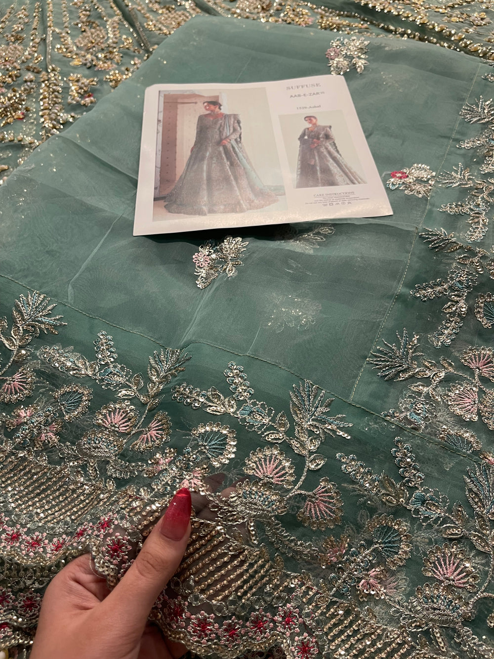 Ashal (ours is an inspired article) is an ethereal mint masterpiece crafted for the modern bride who loves timeless elegance. The ensemble features delicate hand-embellished details, glistening florals, and intricate threadwork that come together in a soft, romantic flow. Its graceful silhouette, paired with a beautifully embroidered dupatta, creates a fairytale aura—perfect for weddings, engagements, and grand festive soirées.