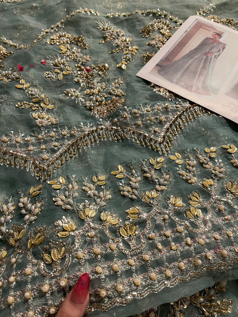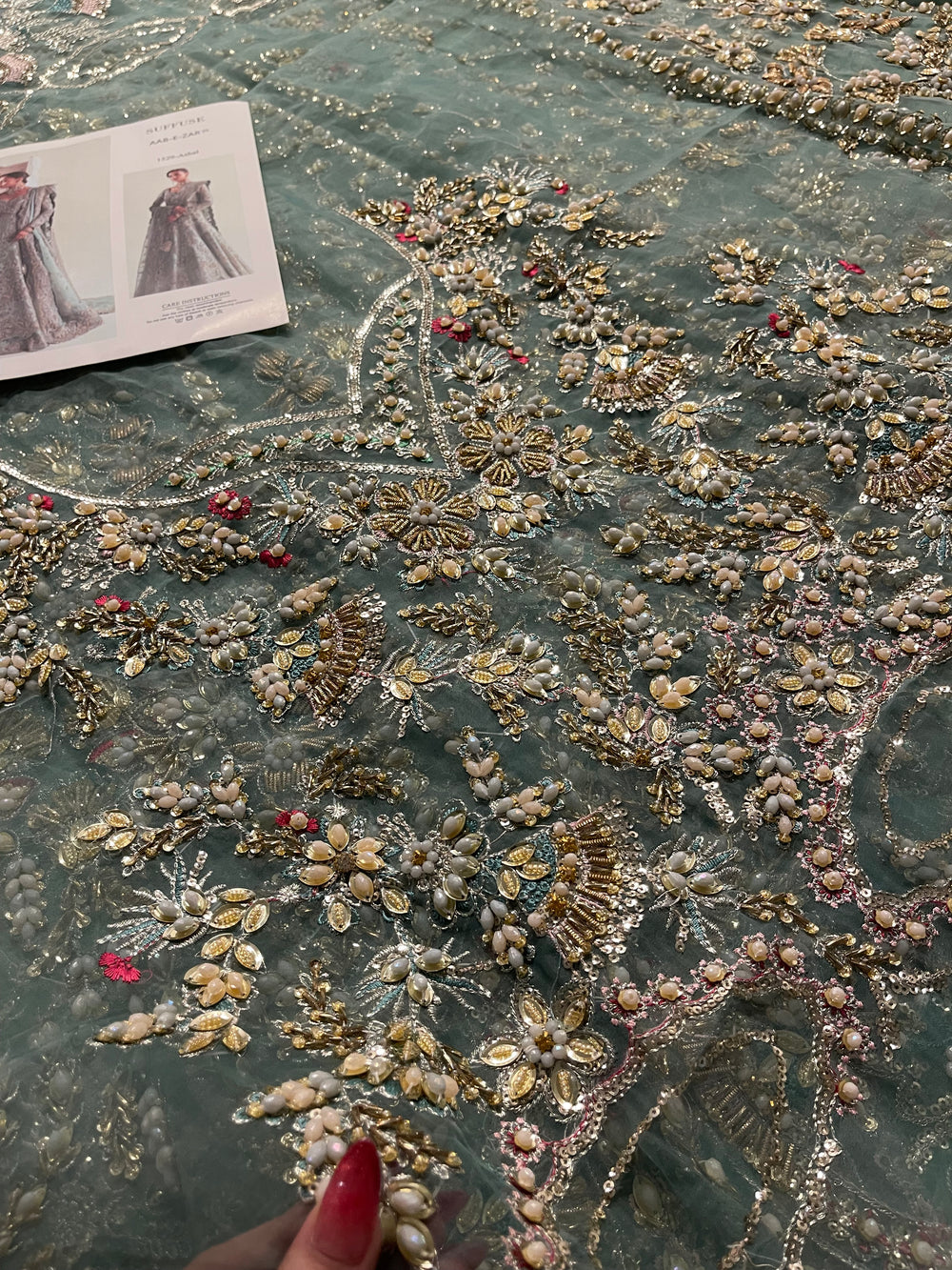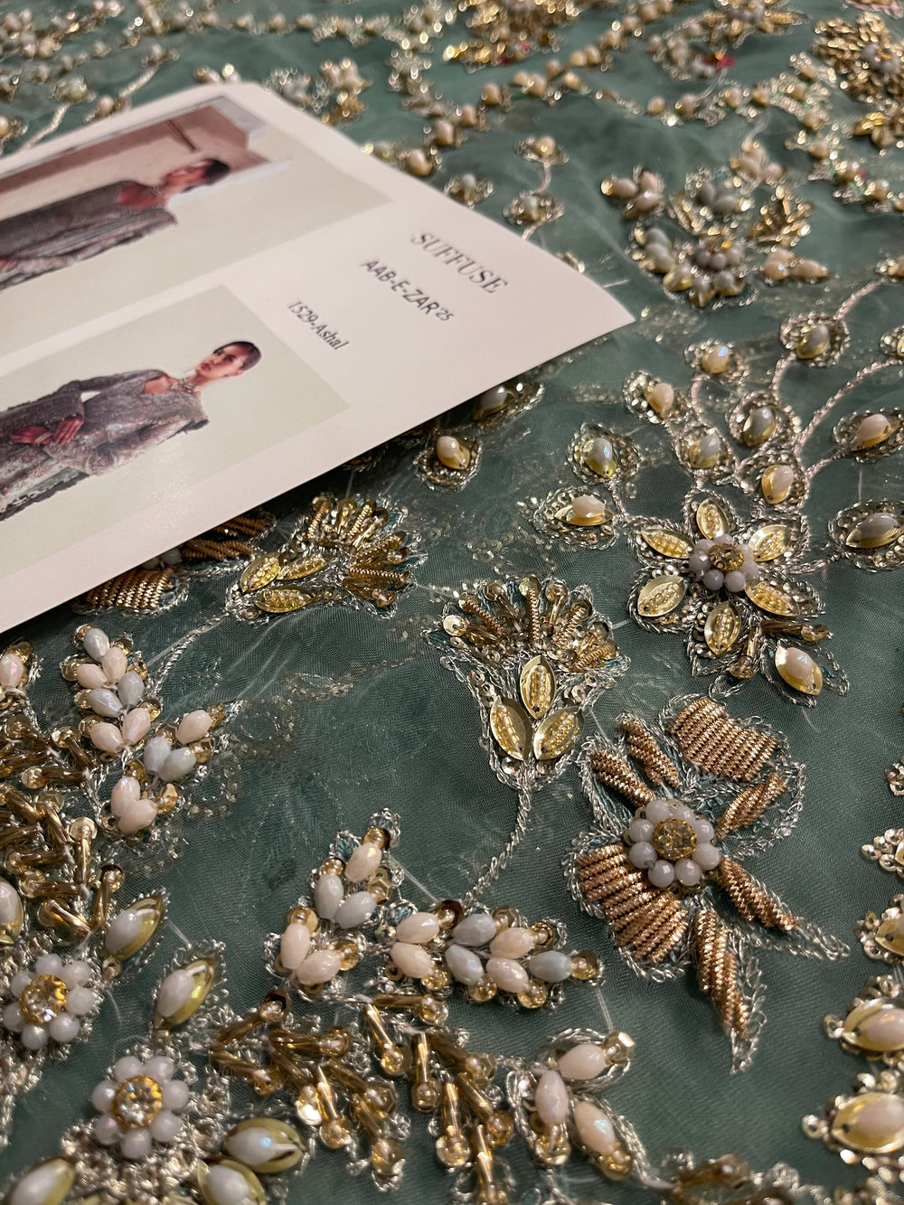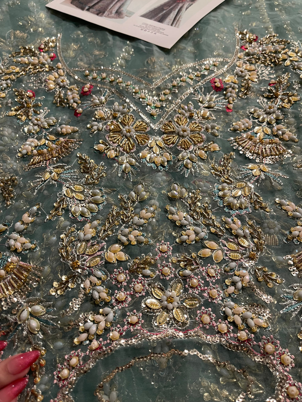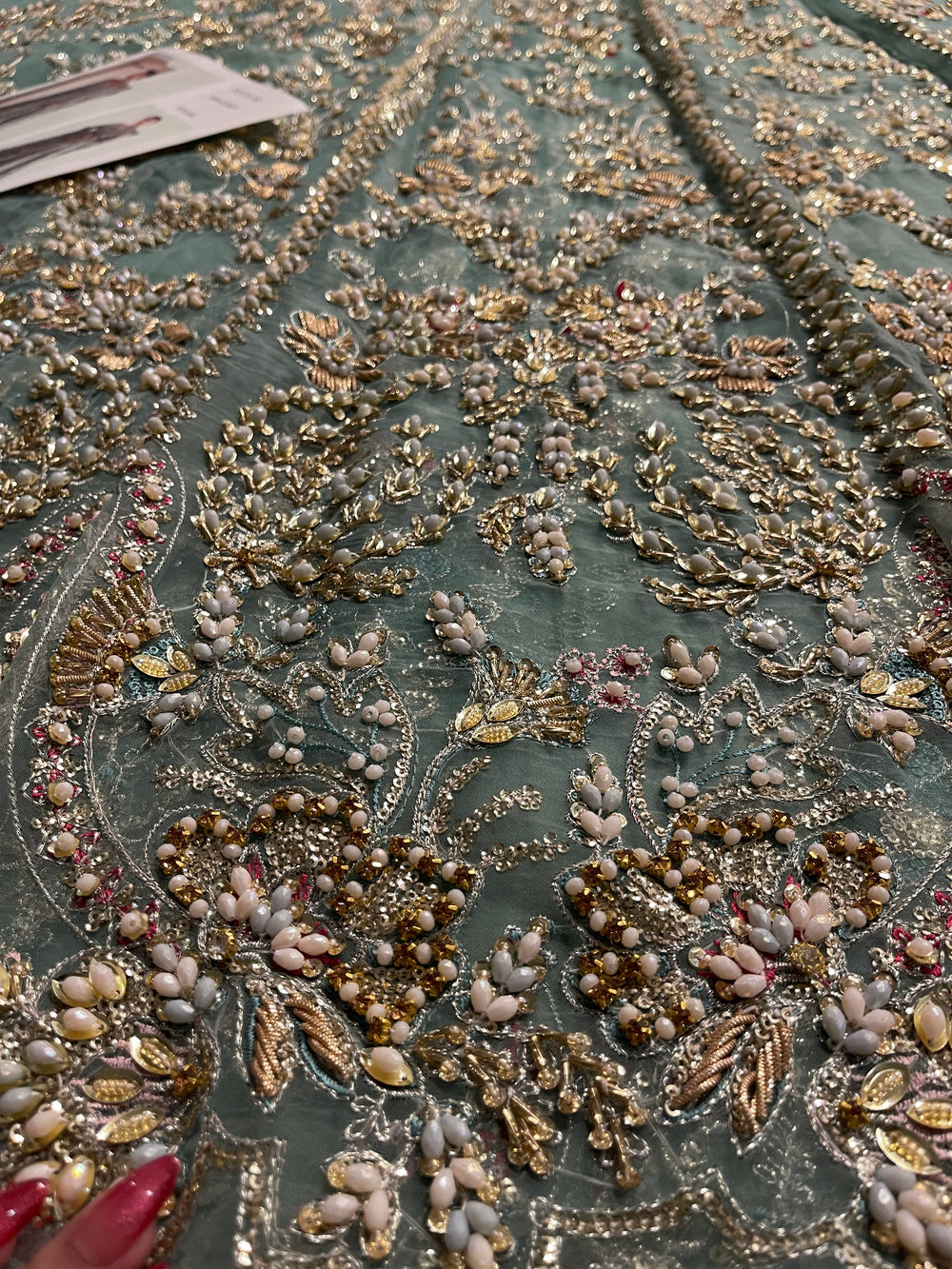 Ashal (ours is an inspired article) is an ethereal mint masterpiece crafted for the modern bride who loves timeless elegance. The ensemble features delicate hand-embellished details, glistening florals, and intricate threadwork that come together in a soft, romantic flow. Its graceful silhouette, paired with a beautifully embroidered dupatta, creates a fairytale aura—perfect for weddings, engagements, and grand festive soirées.