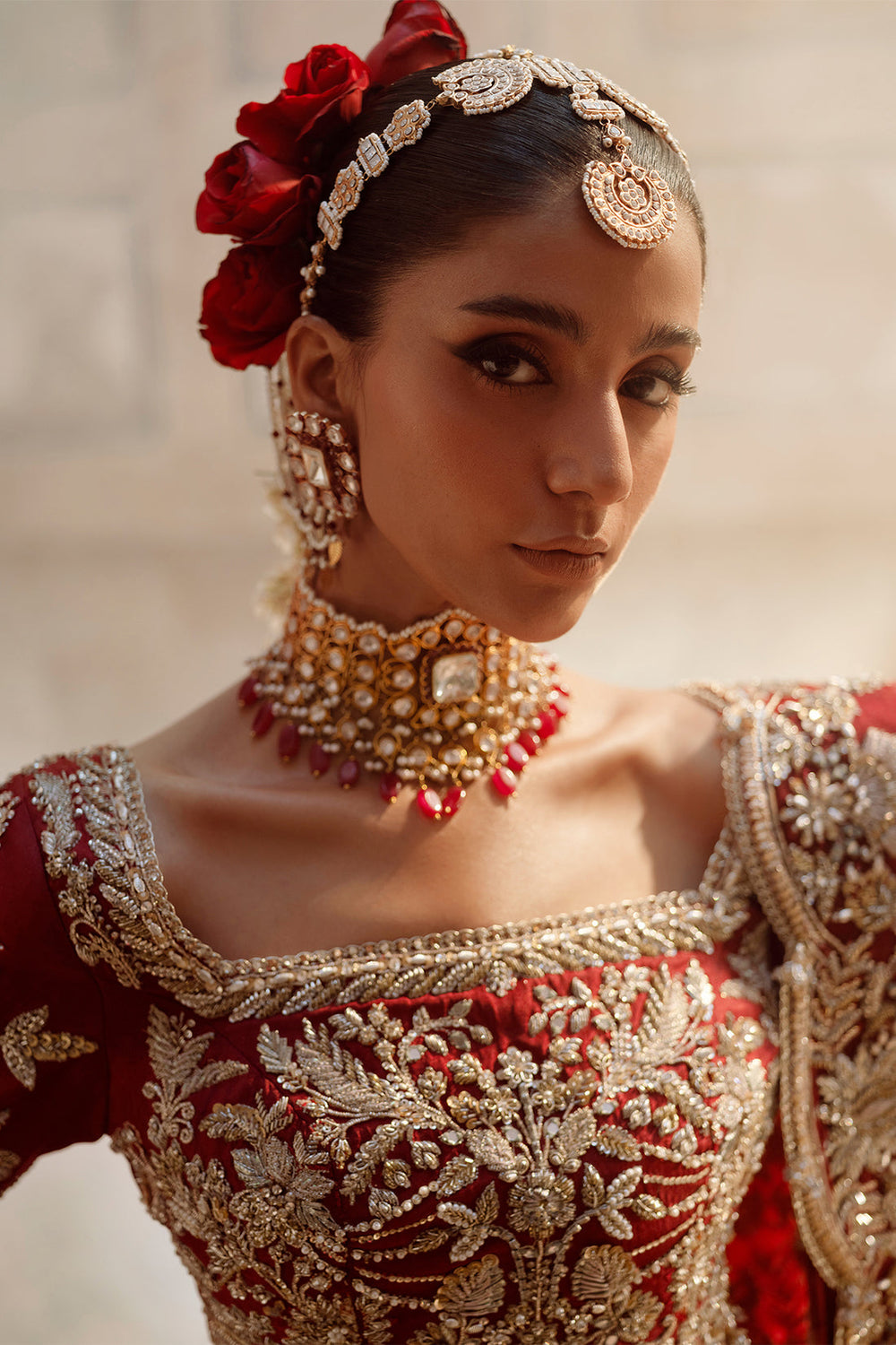 A timeless bridal masterpiece in deep crimson, Amara is crafted with intricate handwork that softly glimmers across its richly adorned canvas. The classic silhouette exudes regal charm, while delicate detailing weaves a story of tradition and modern elegance. Paired with a gracefully embellished dupatta, this ensemble strikes the perfect balance between heritage and sophistication, making it an unforgettable choice for a bride who wishes to embody grace and grandeur.