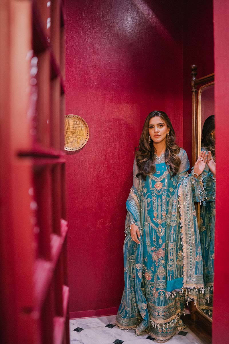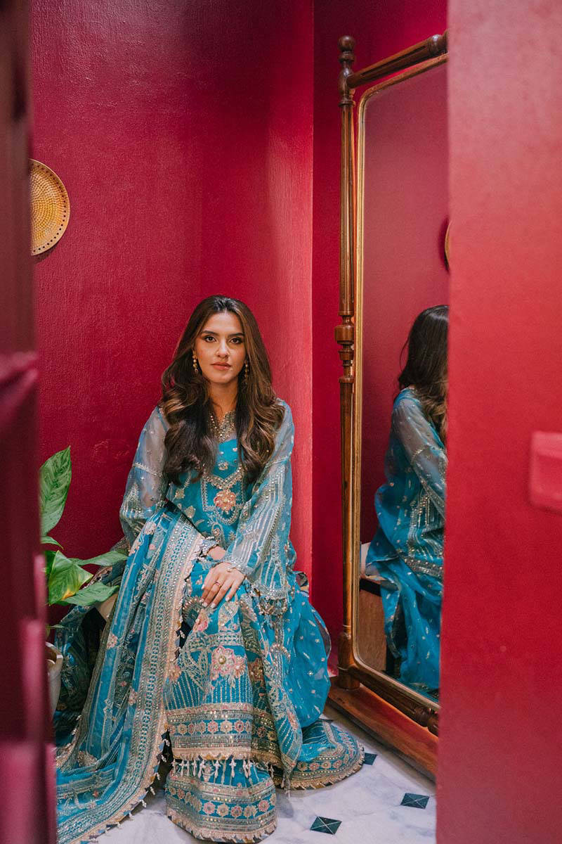 Sajal is seen wearing Umber, set on a dreamy asmaani blue organza base; The stellar outfit is doused with lush embroideries depicting classic arches, flora extracted from Mughal architectures made of fine strands of tilla, resham and accents of panni further enhanced by our signature hand embellishments. The composed shirt is matched with a generously worked lattice dupatta framed with embroidered borders and embroidered dhaka pajama finished with detailed borders.