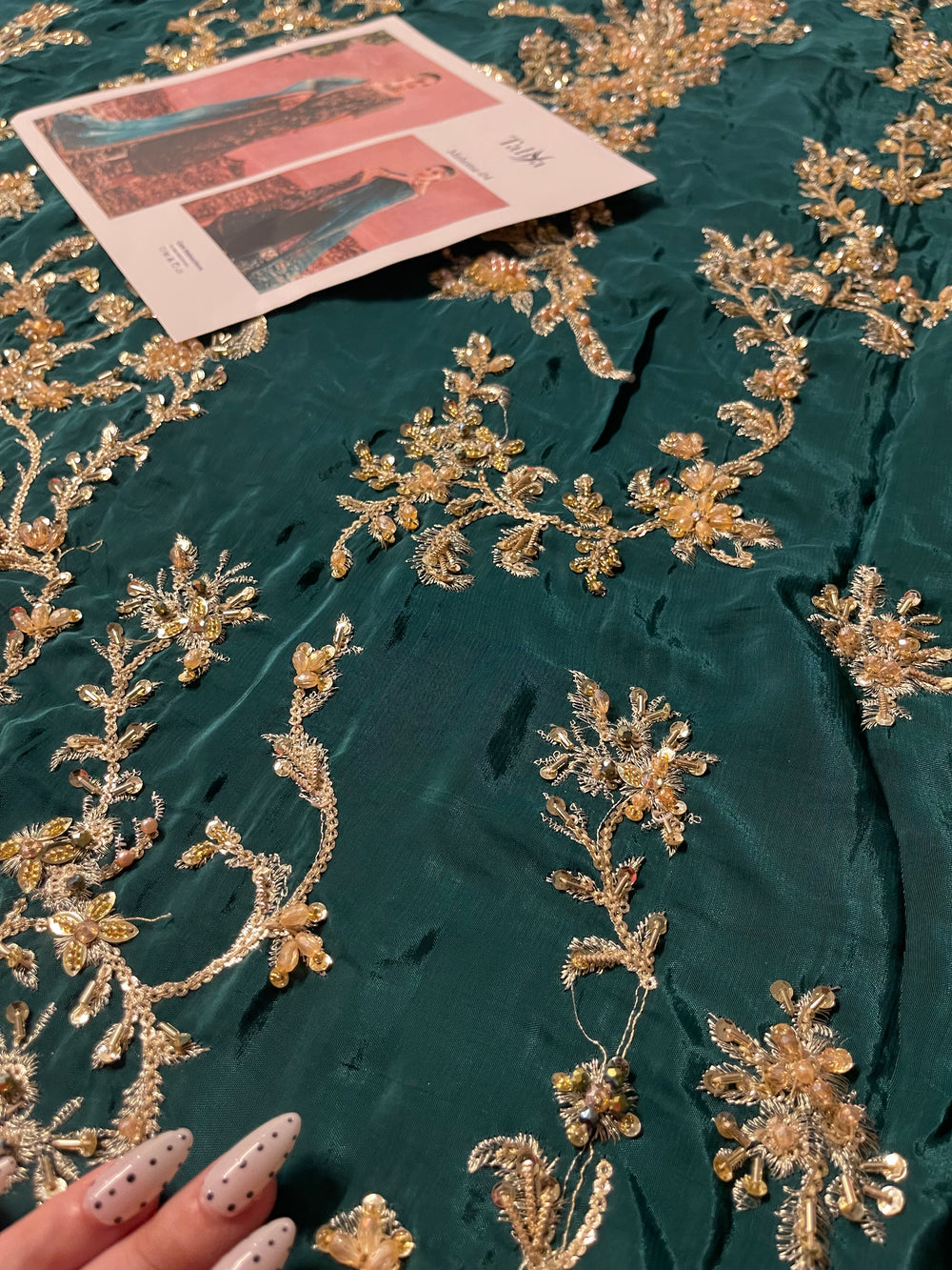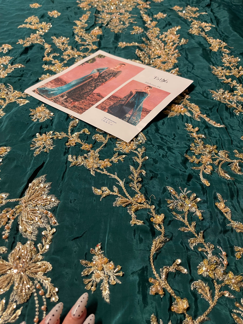 Paired with a soft, fluid net dupatta adorned with delicate sparkle accents, the look carries a dreamy, ethereal aura. The blend of deep green tones and warm golden ornamentation creates an elegant contrast, making the ensemble a beautiful choice for anyone who wants a sophisticated yet regal appearance.