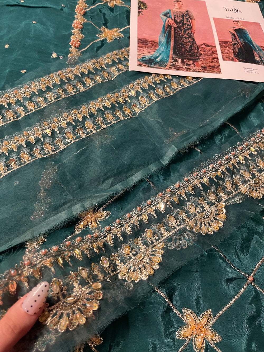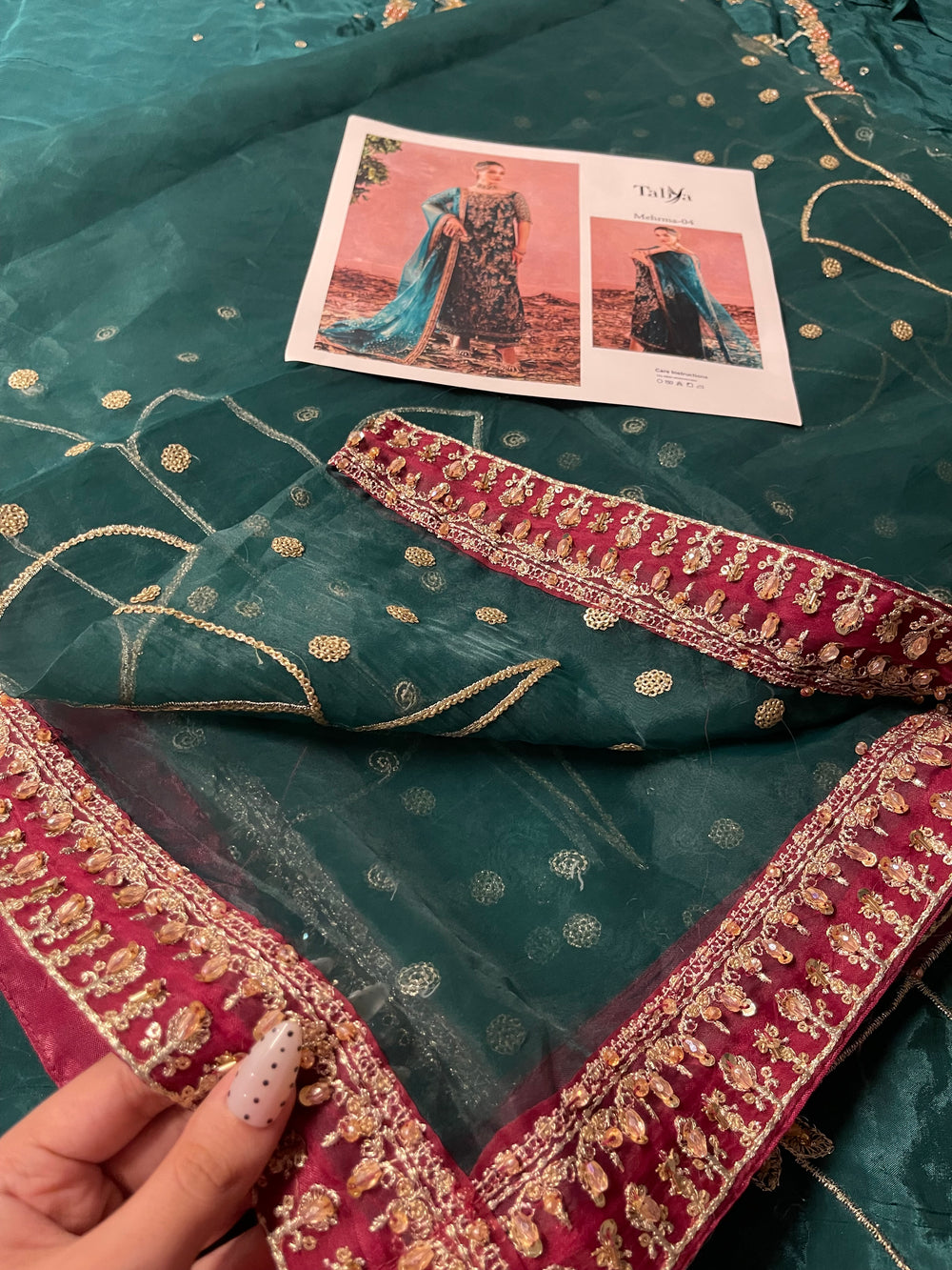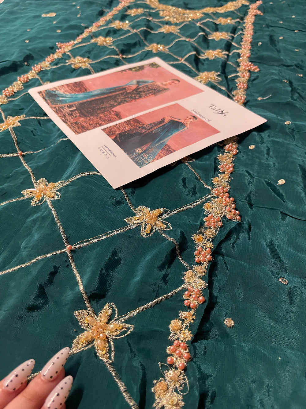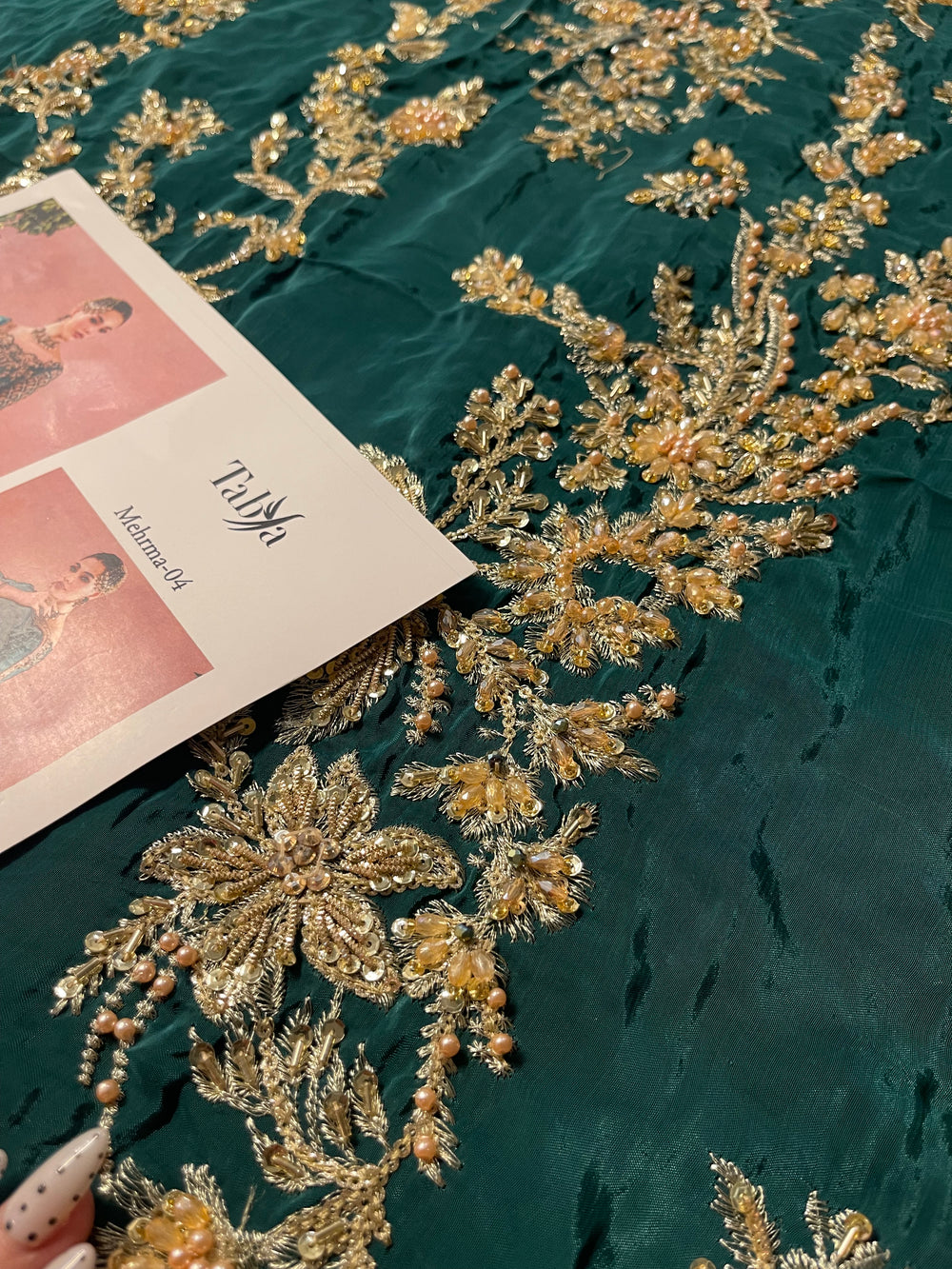 Elevate your festive wardrobe with this Mehrma-inspired emerald ensemble, crafted in a rich jewel-tone base that instantly stands out. The outfit features intricate gold-toned detailing that creates a luxurious, traditional charm without feeling heavy. The silhouette is timeless and flattering, offering graceful structure while allowing comfortable movement — perfect for weddings, receptions, and all celebratory occasions.